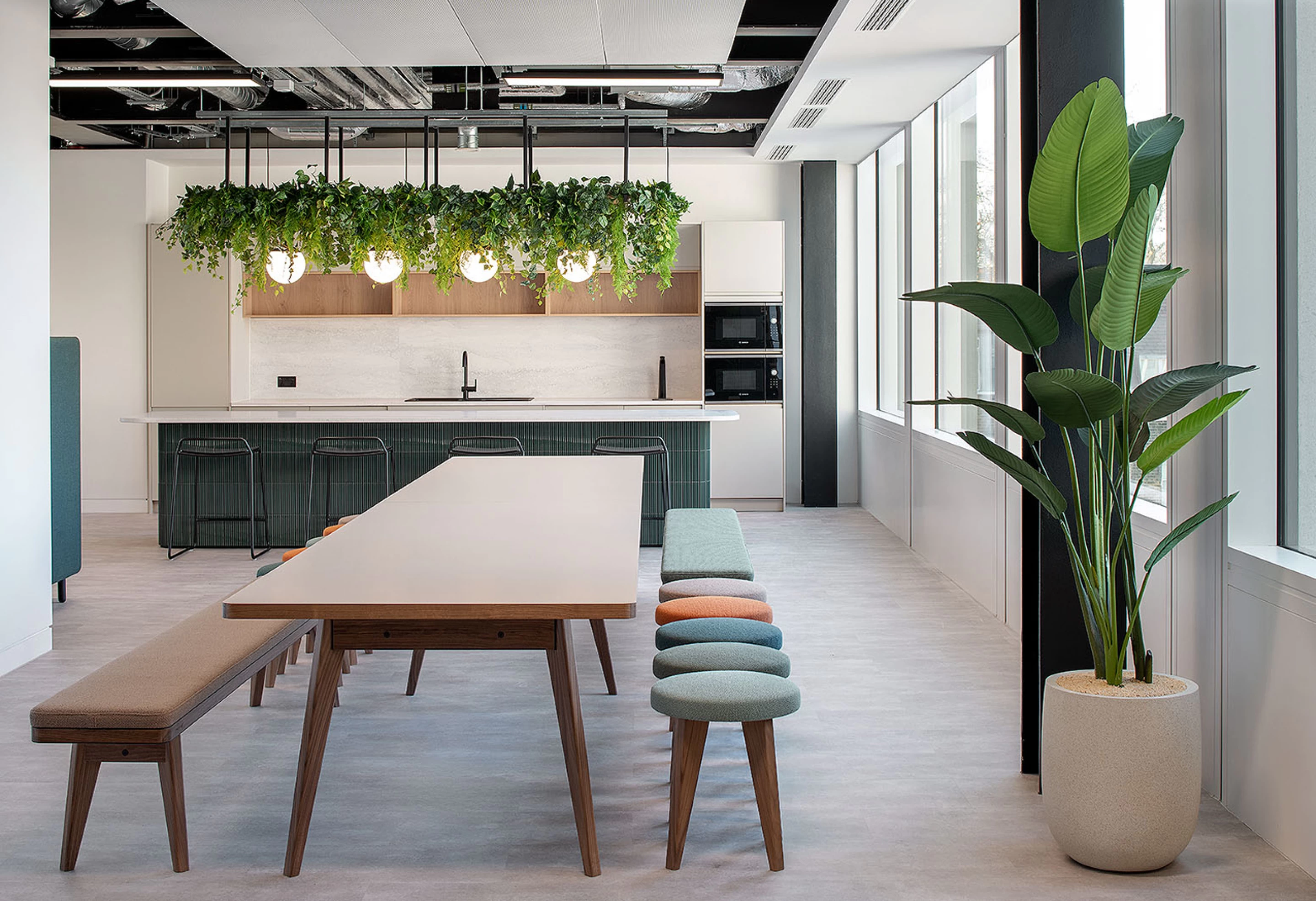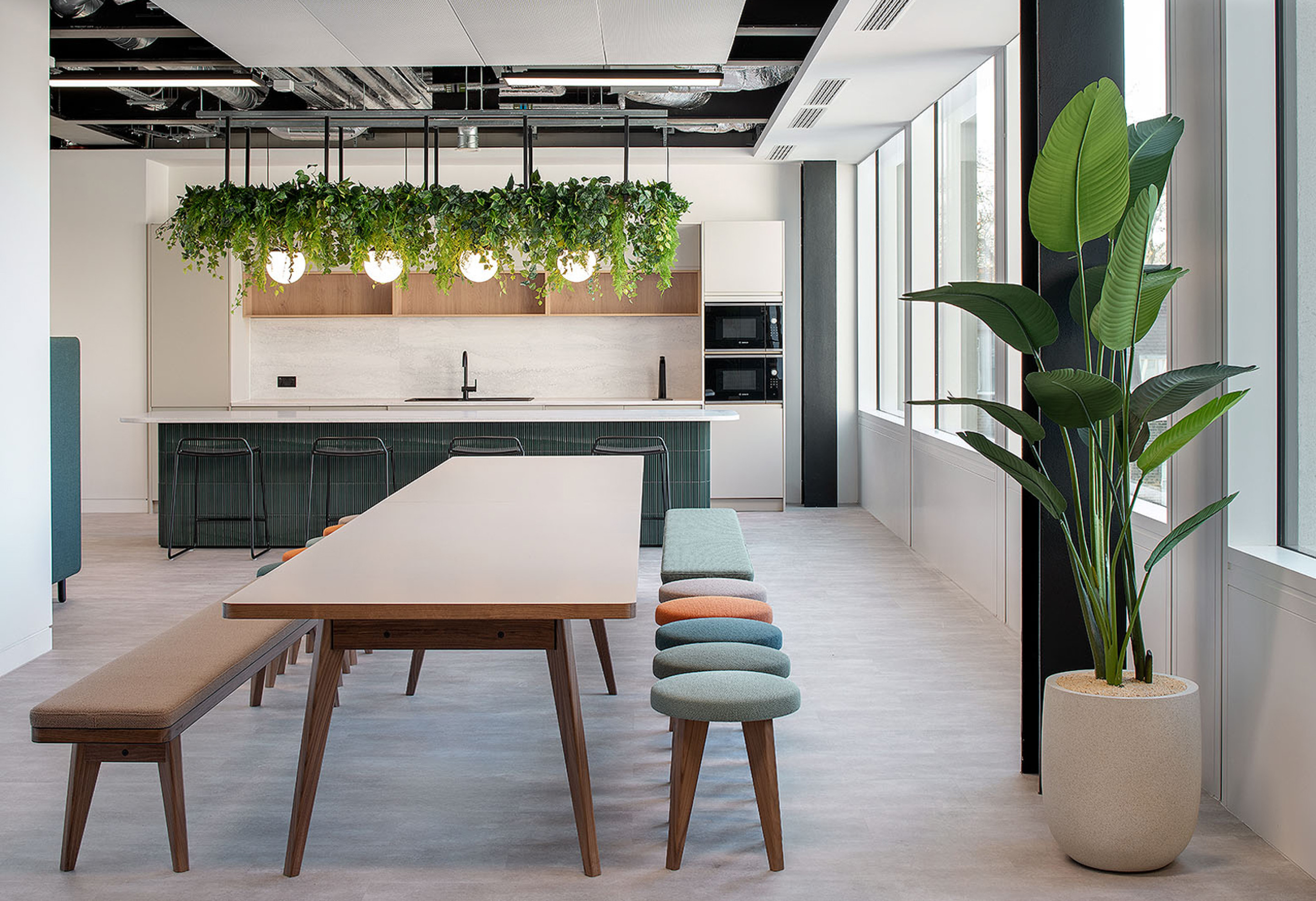 The Osprey table, measuring 3.5 metres in length, was provided in two sections and comfortably seats up to 14 people. To create a cohesive aesthetic, matching stools and benches were specified alongside it. These setups feature across both the second and fifth floors of the building, ensuring consistency throughout the workspace.