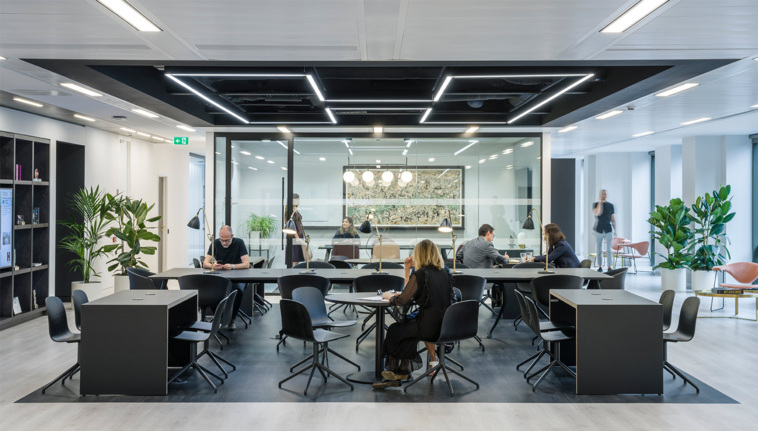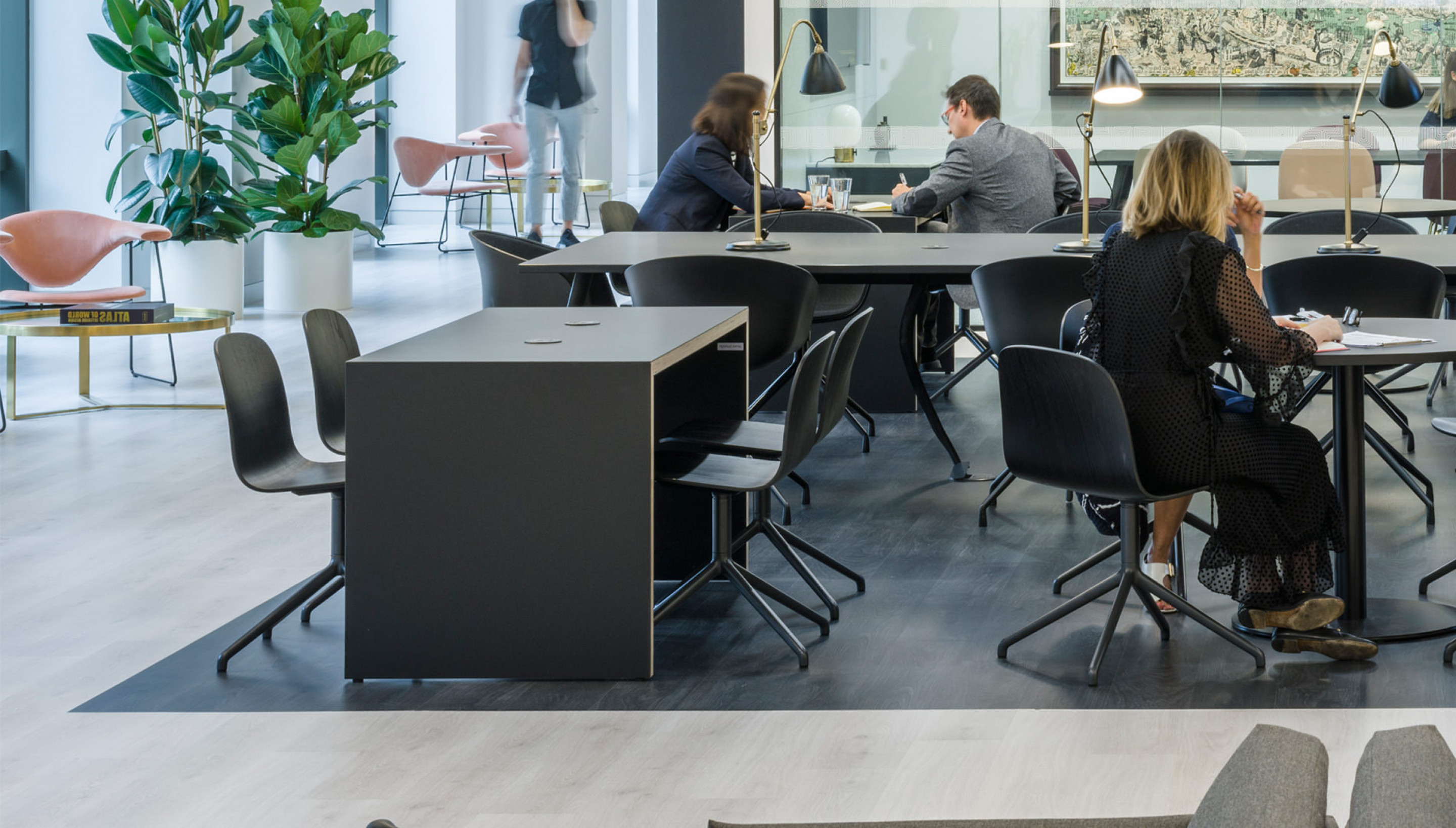 Gensler architects decided to treat the space like a "real home"; with shared accessible spaces that then branch off into brand "neighbourhoods". The James Burleigh Waldo/45 was selected within one of the zoned areas, as part of the interiors scheme. The slab end style tables allows employees to socialise and work together in the open plan space.