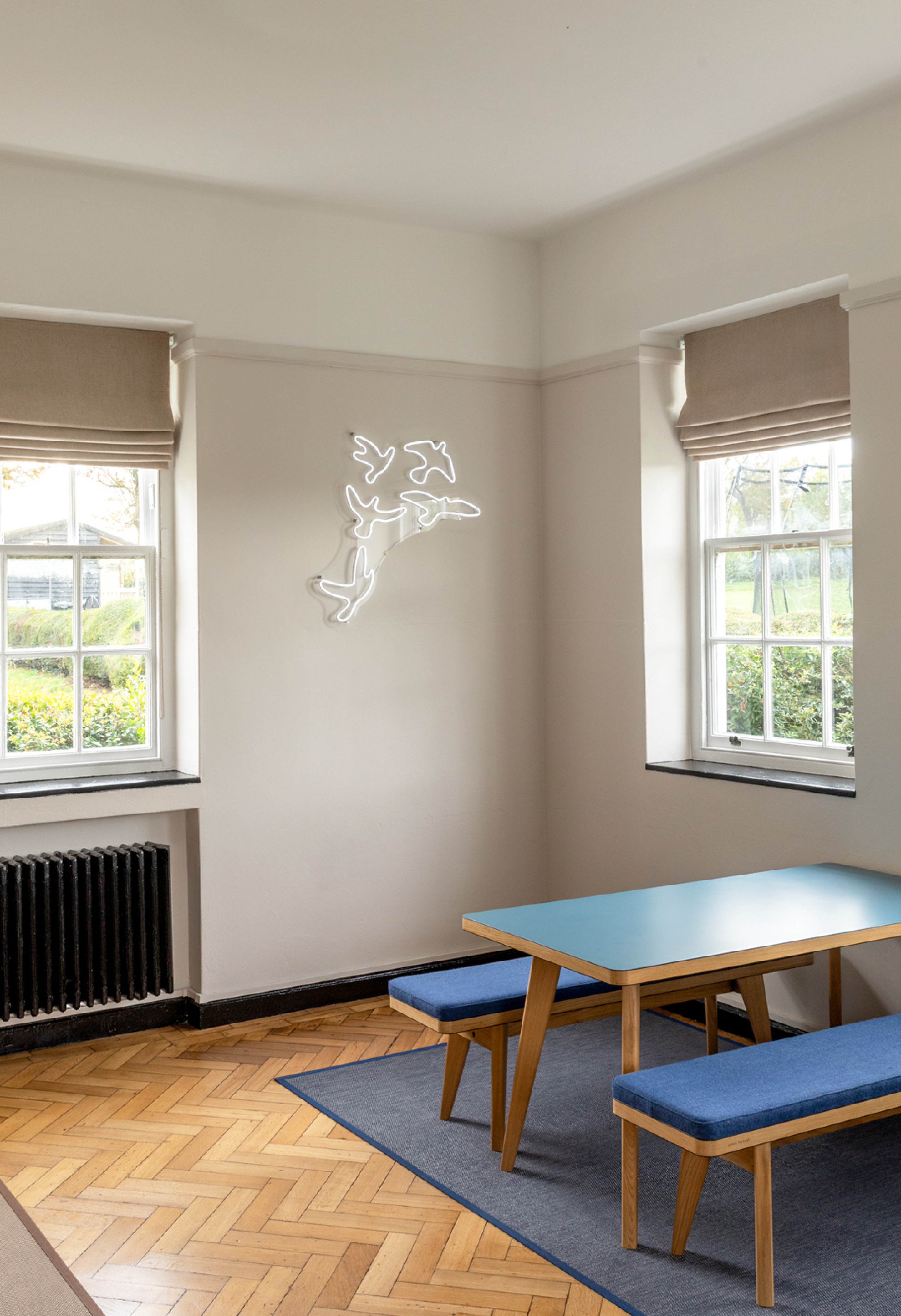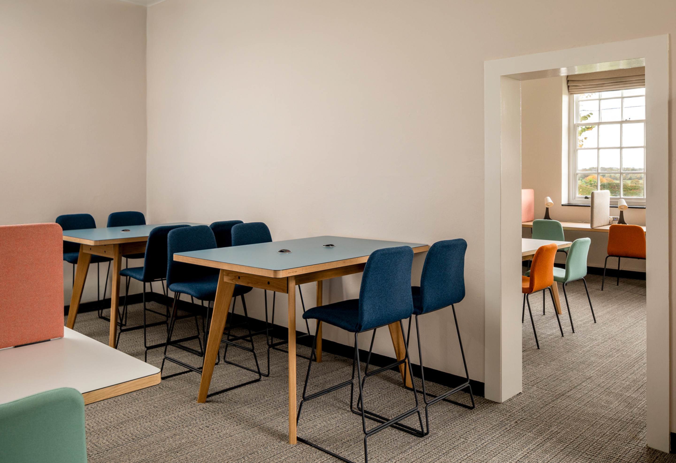 At the heart of the scheme are James Burleigh’s Osprey and Coda tables, specified by Pea Green Studios for their refined craftsmanship, exceptional durability, and ability to adapt to busy, multi-purpose spaces. The clean lines of the tables pair effortlessly with soft, calming tones and playful accents, creating rooms that feel both engaging and serene.