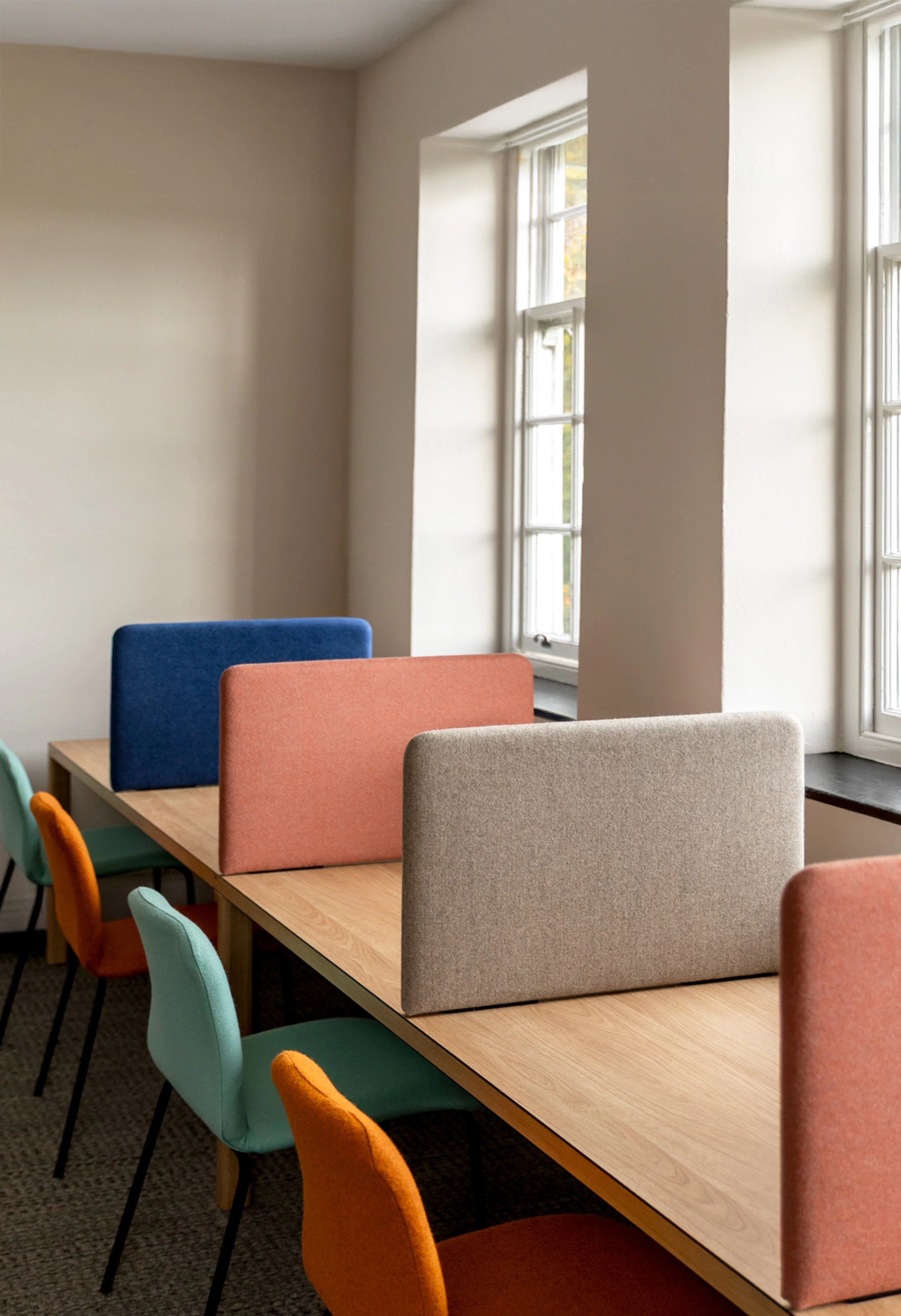 Across the prep rooms, individual study zones are defined using thoughtfully coloured desk screens, ensuring pupils have comfortable and focused spaces for independent work. Generous natural light, paired with the understated warmth of timber furniture, enhances the sense of calm and concentration.